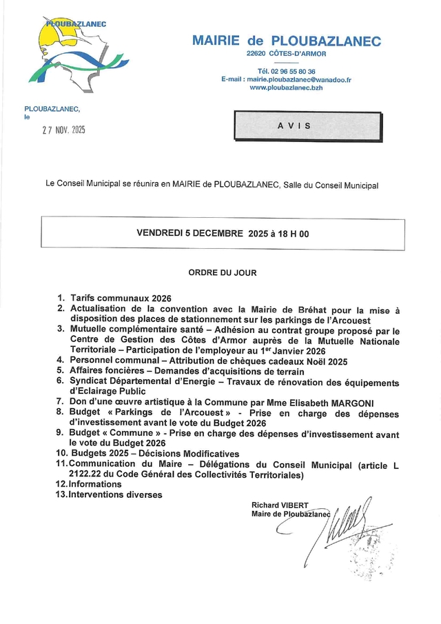 CONSEIL MUNICIPAL VENDREDI 5 DÉCEMBRE 2025 dimanche 30 novembre 2025 Le prochain Conseil Municipal se tiendra le vendredi 5 décembre à 18h00, dans la salle du Conseil de la mairie de Ploubazlanec.