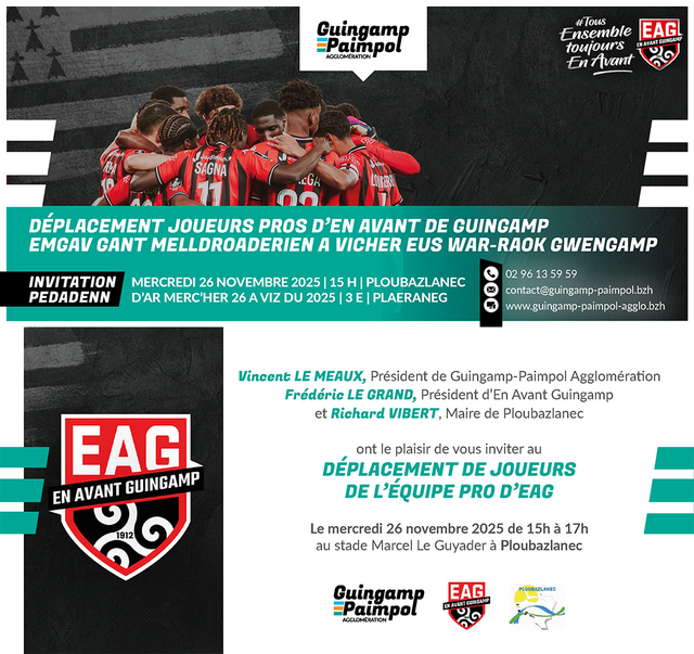 DÉPLACEMENT JOUEURS EN AVANT DE GUINGAMP dimanche 23 novembre 2025 Les joueurs pros d’En Avant de Guingamp se déplaceront au stade Marcel Le Guyader à Ploubazlanec, le mercredi 26 novembre 2026, de 15 à 17h.