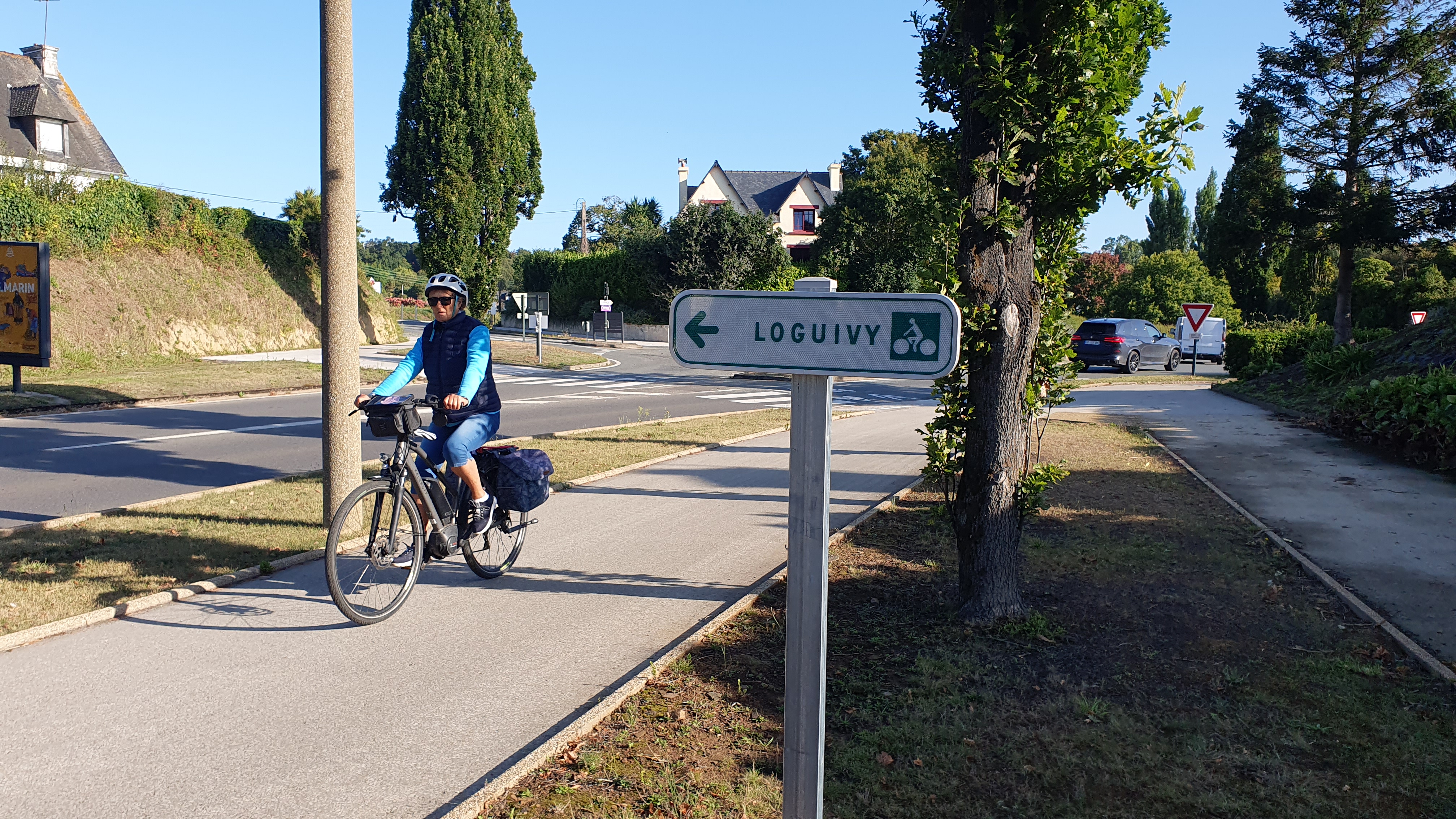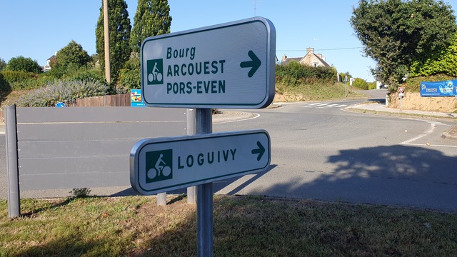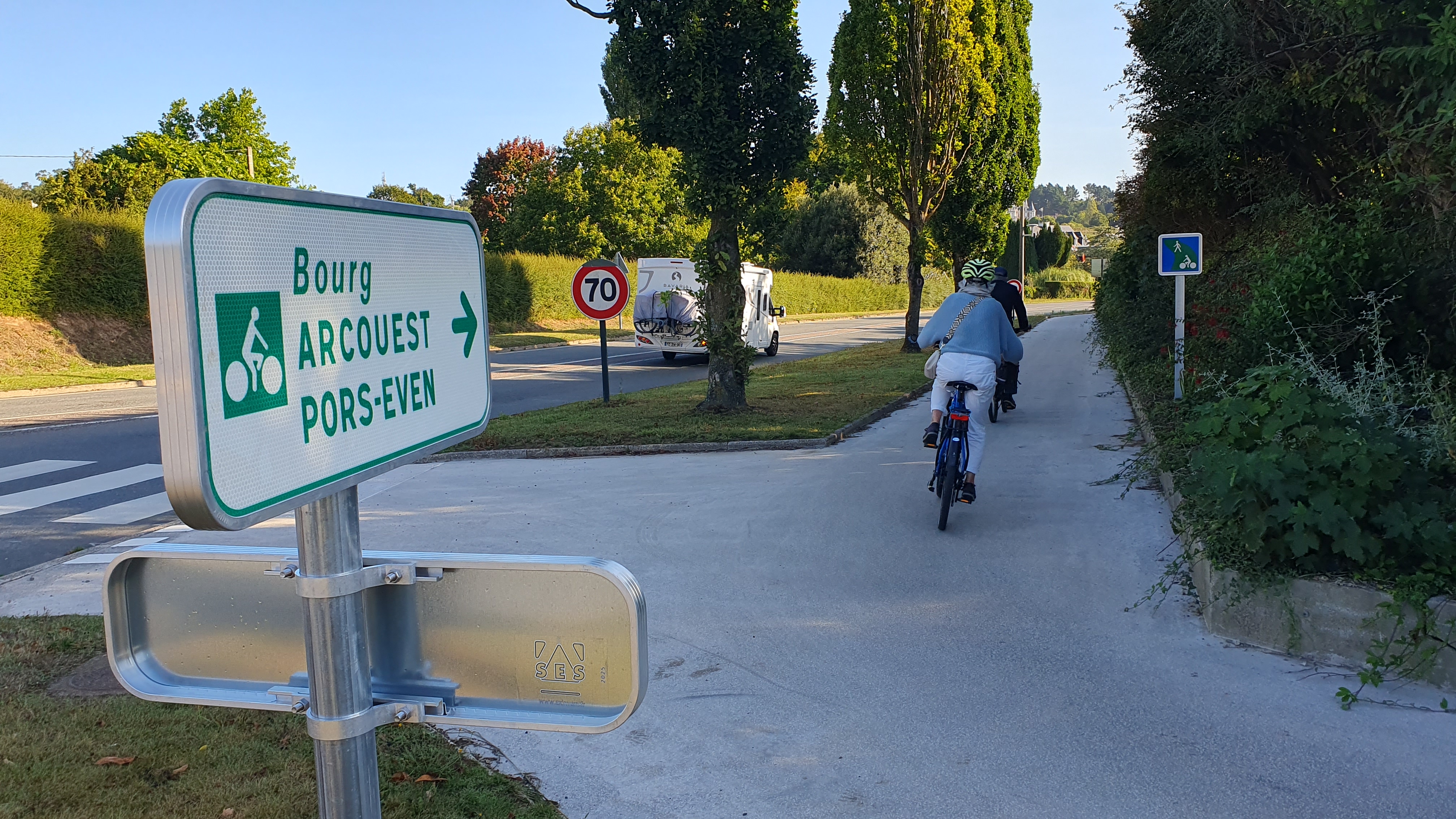 Pour la suite du parcours, ce type de fléchage vert sera installé jusqu’à l’embarcadère de l’Arcouest en utilisant les petites routes moins fréquentées. Une réflexion est menée sur la sécurisation de ce tronçon de même que son aboutissement à l’Arcouest qui devrait se faire par le chemin de Cornec avec un aménagement pour la traversée du parking de Cornec.