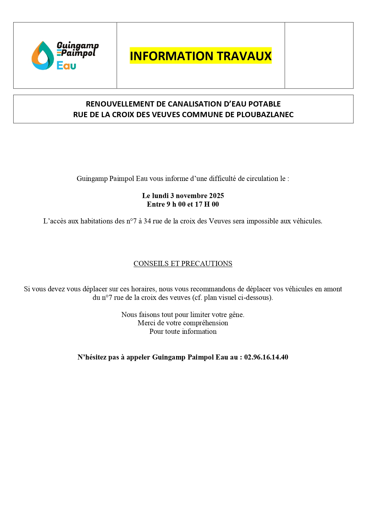 INFORMATION ARRÊT D’EAU / TRAVAUX DE RENOUVELLEMENT RÉSEAUX AEP LA CROIX DES VEUVES PLOUBAZLANEC