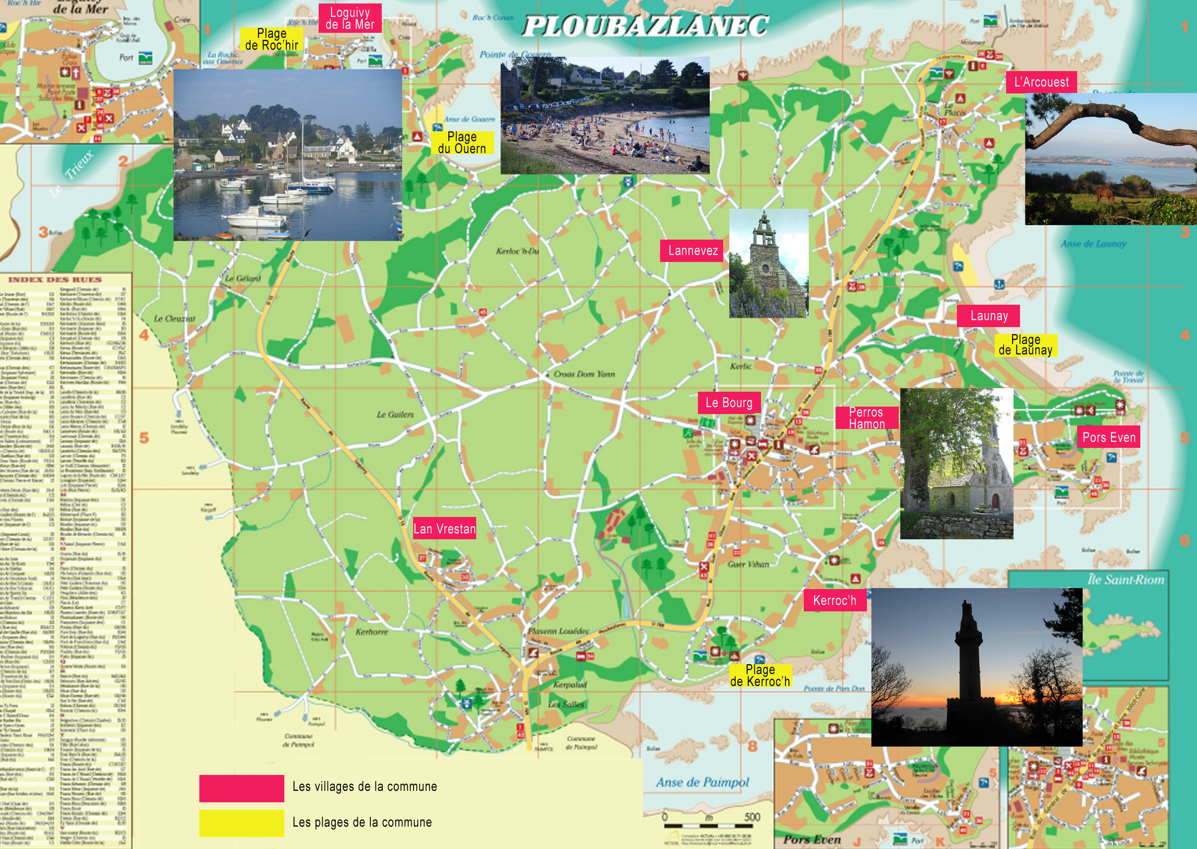 9 villages se partagent le territoire : au centre le Bourg de Ploubazlanec (Ploubaz), 2 ports de pêche : Loguivy-de-la-Mer au NW et Pors Even à l’E, l’Arcouest au NE et Launay à l’E, Lan Vrestan à l’W et Kerroc’h au S, au N du bourg Lannevez et à l’E Perros Hamon. Chaque village mérite une attention particulière et une découverte qui séduira le promeneur.