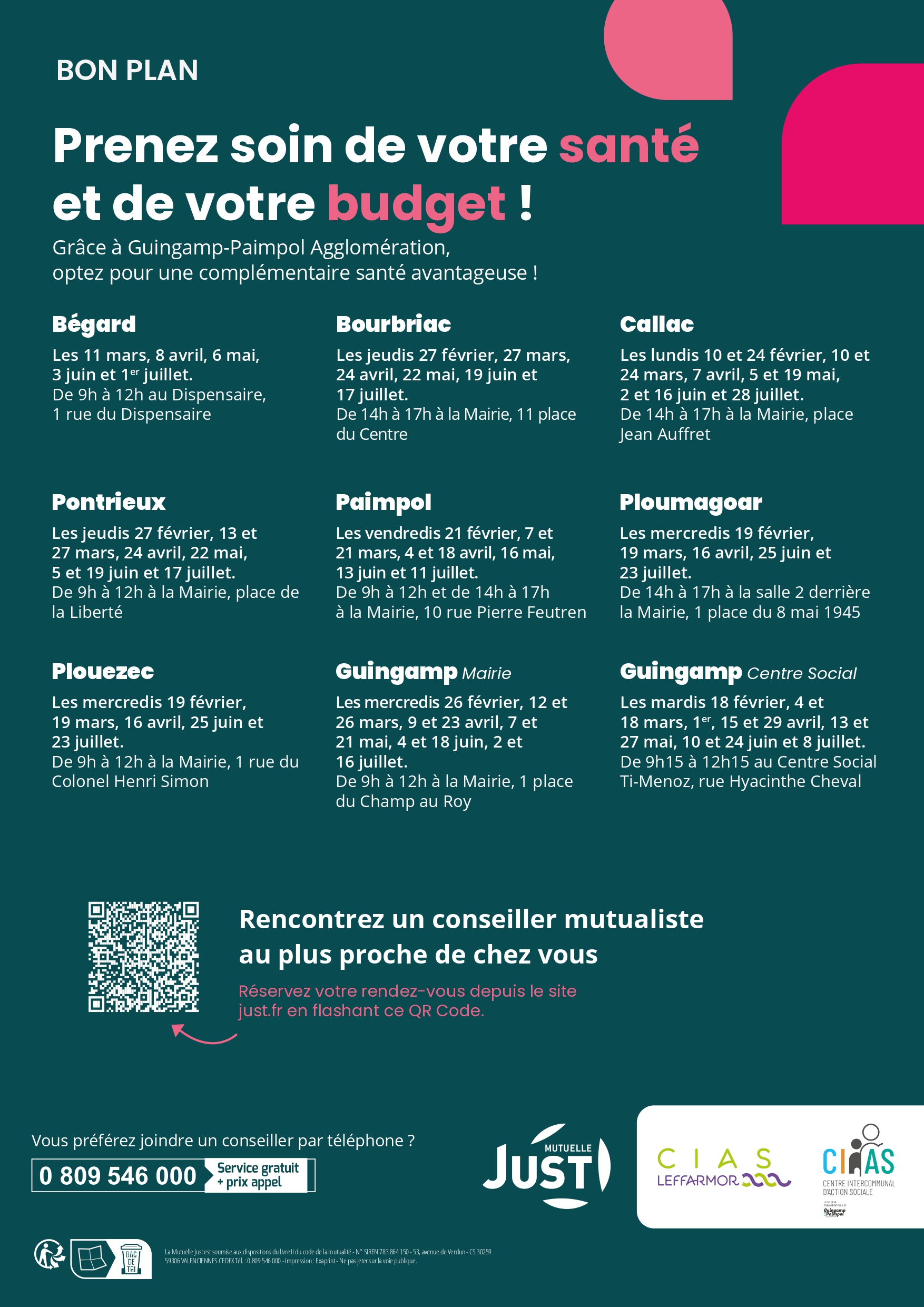 Pour obtenir votre devis, prenez sans attendre un rendez-vous avec un conseiller mutualiste : saisissez "Guingamp-Paimpol Agglomération" sur le site https://www.just.fr/rdv ou bien appelez le 0 809 546 000 (service gratuit + prix de l’appel).