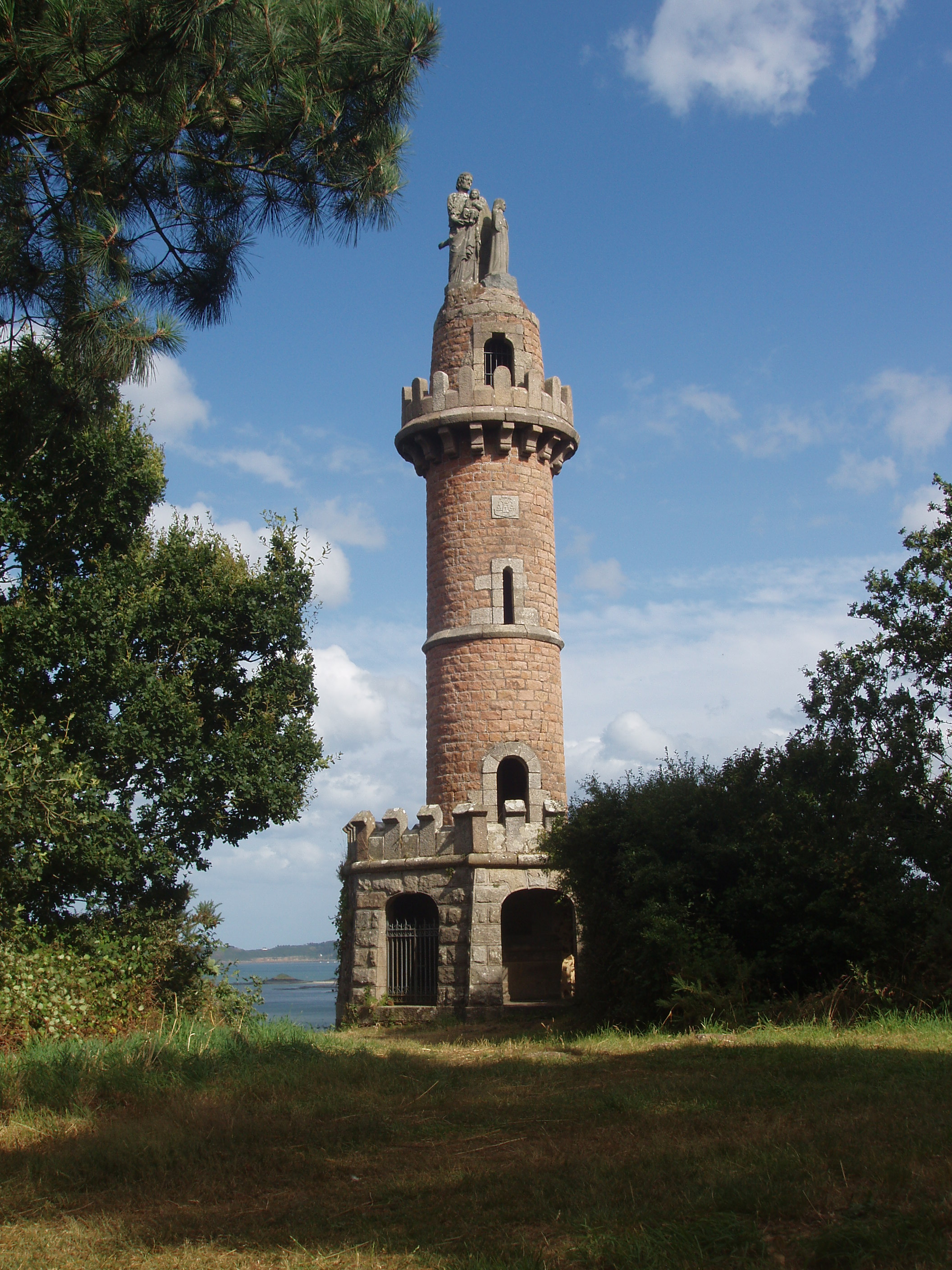 Cette structure quelque peu insolite, devenue l’emblème usuel de la commune, fut édifiée au siècle dernier, au sommet de la butte appelée alors Krec’h Mahaf ou Mazé, c’est-à-dire Mathieu, d’où l’on embrasse la baie de Paimpol. Dépassant les espérances de l’abbé Guennou, qui pensait y élever une simple statue de Marie, une tour de granit fut érigée sur le monticule, surmontée d’abord de la statue de sainte Anne et plus tard de celle de la Vierge et de saint Joseph avec l’Enfant Jésus.